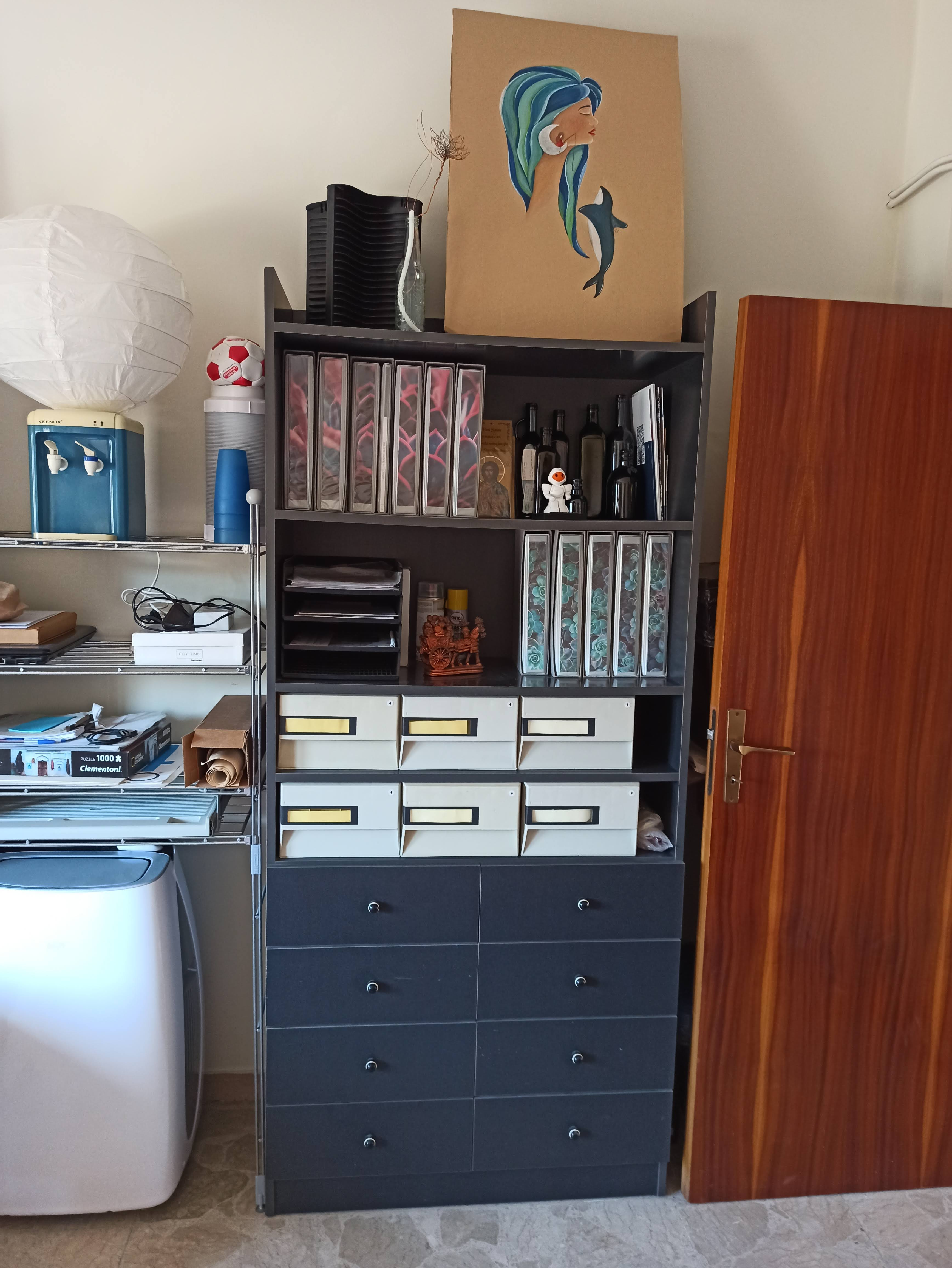 Scaffale composto da tre mensole ed 8 cassetti in antracite.